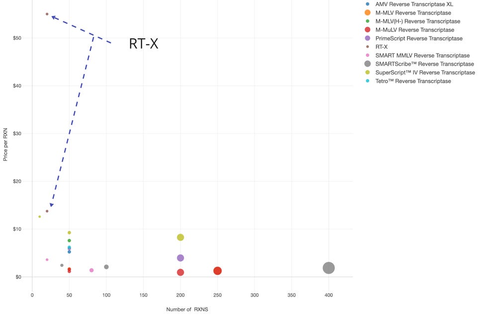 The dot plot below shows tight clusters of price/reaction at common kit sizes of 50 and 200 reaction size kits. Interestingly, RT-X’s for-profit pricing is significantly higher than the market leader, SuperScript IV, while the non-profit pricing is slightly higher. This could present a couple of issues for the new contender though it is not without its benefits.