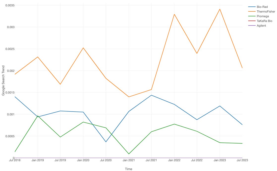 Another look at the 5-year US and worldwide (data not shown) to assess interest as a proxy for market share identifies ThermoFisher SuperScript IV as the 5-year market leader, followed by BioRad, Promega, and Agilent. TaKaRa, a niche offering, and others did not show significant interest. This data suggests RT-X will heavily compete with these companies that also serve its target applications in sequencing, gene expression, and gene editing.