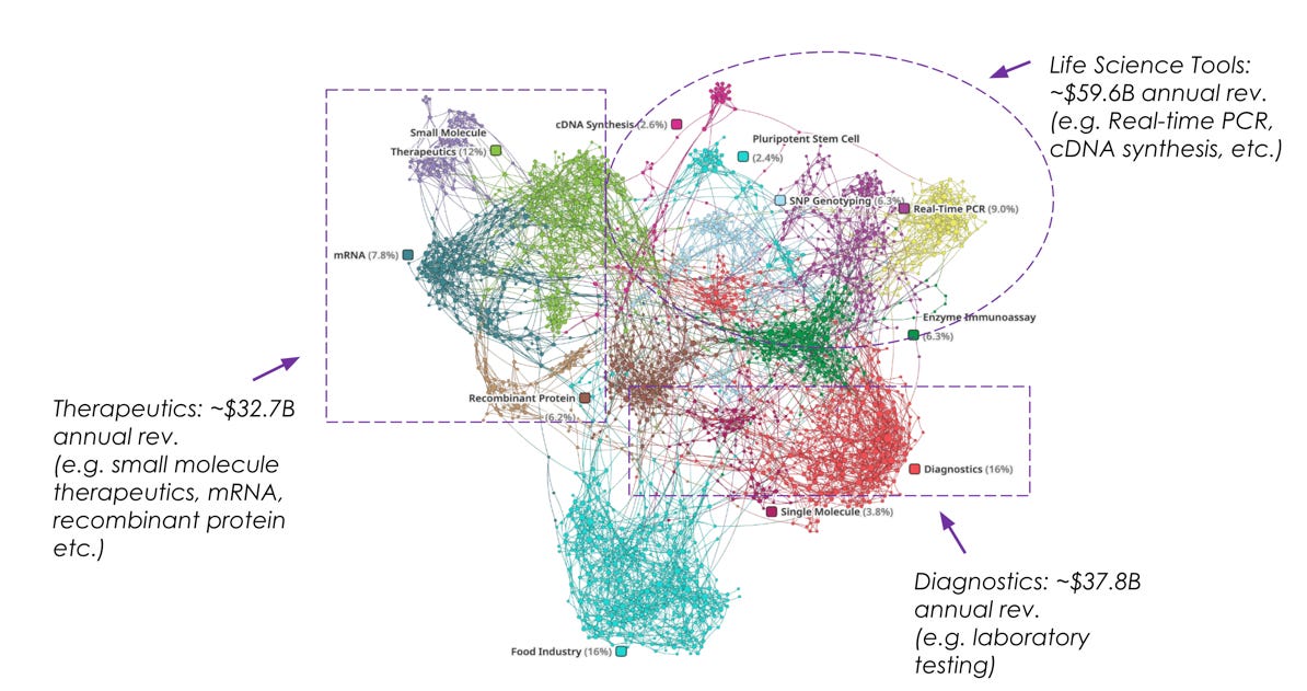 Network analysis1 combined with advanced natural language processing can be used to analyze thousands of publicly available articles related to reverse transcriptase. The network surfaces four distinct addressable market clusters (represented by tightly clustered colored dots in the network) with significant revenue potential - life sciences tools, diagnostics, therapeutics, and the food industry.