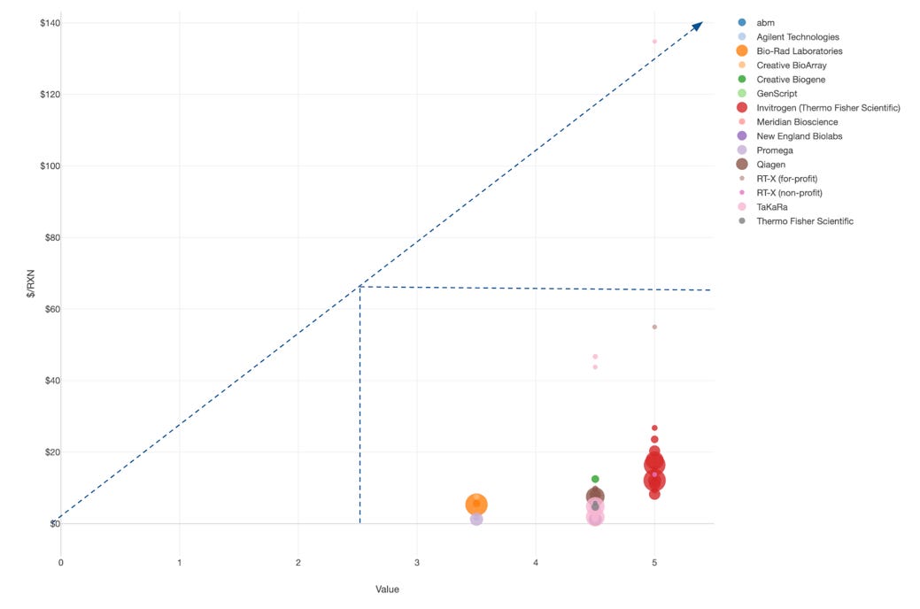 As anticipated for a mature market, most products cluster in the high value at bargain pricing (bottom right), except TaKaRa’s SMARTer Pico PCR cDNA Synthesis Kit is an outlier in the high value at over market rate.
